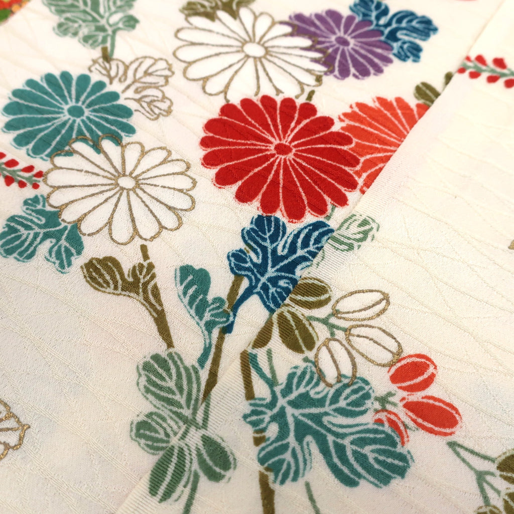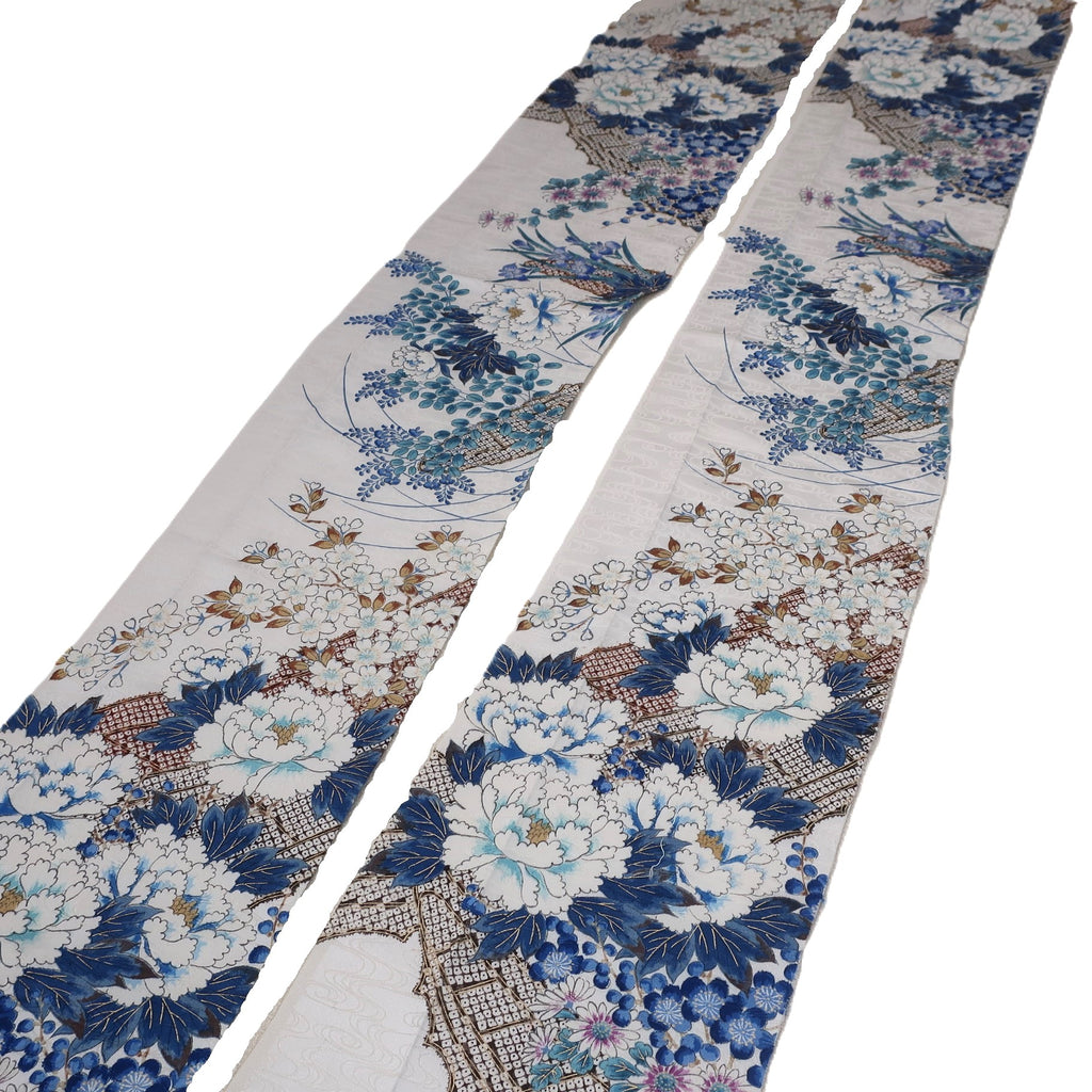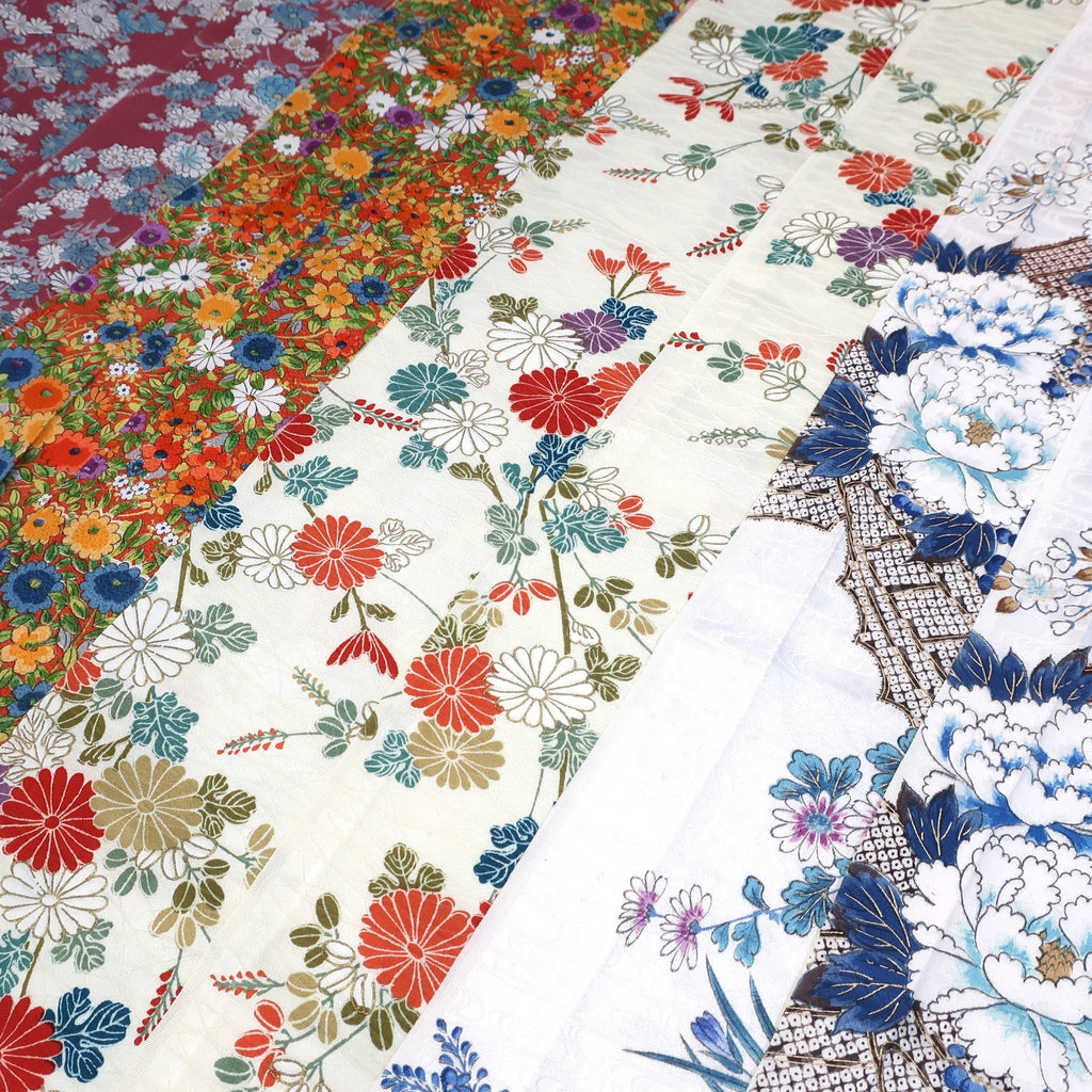 These are fabric pieces cut from pre-owned kimonos. Each piece is part of the original textile, with patterns that are not created by joining different fabrics.