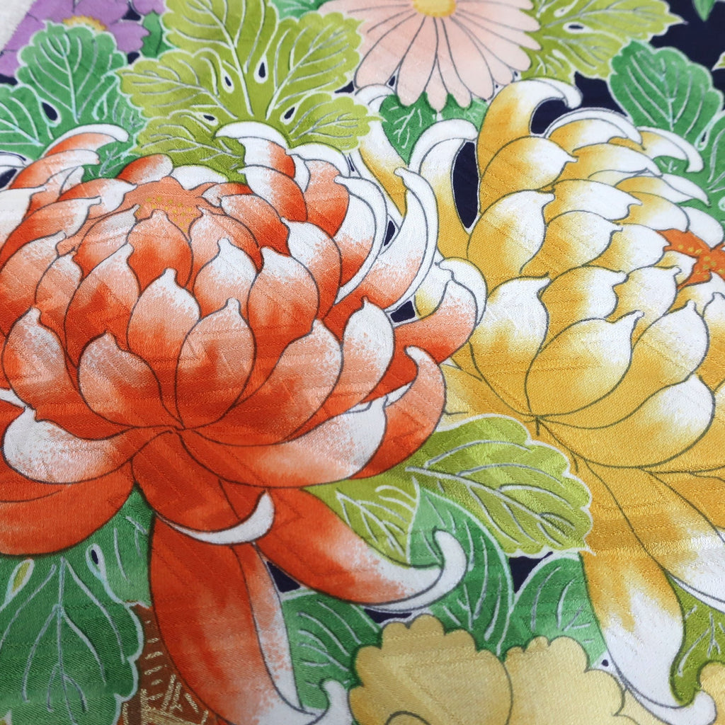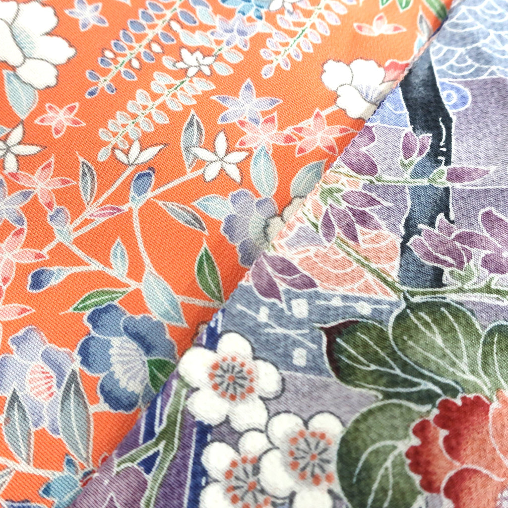 These are fabric pieces cut from pre-owned kimonos. Each piece is part of the original textile, with patterns that are not created by joining different fabrics.