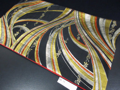 Fukuro Obi Vintage(1950-1980) Black Gold Vermillion Wave Silk BB64W4
