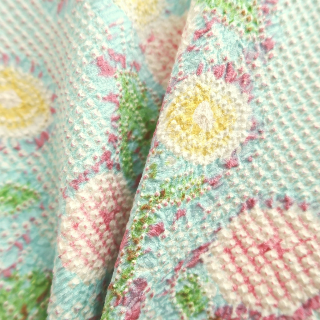 The fabric is a mid-weight Silk, smooth-textured with a slightly puffy and lustrous finish typical of hand tied tie-dye (shibori).