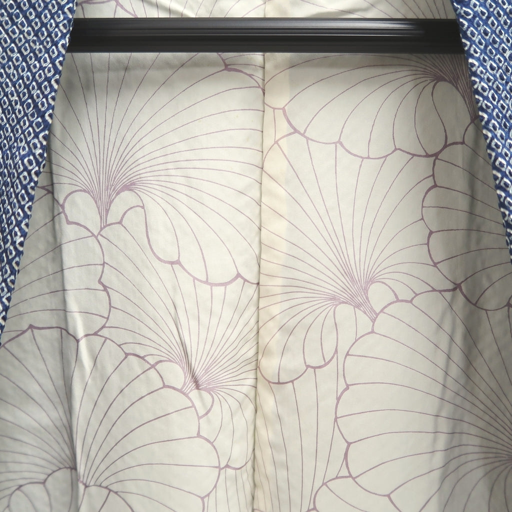 This vintage shiobori haori showcases an elegant Plum blossom motif, a refined expression of Japanese artistry. The tie-dye technique highlights the flow of the design, making it both a graceful garment and a striking wall display. Perfect for those who appreciate timeless style and traditional craftsmanship.