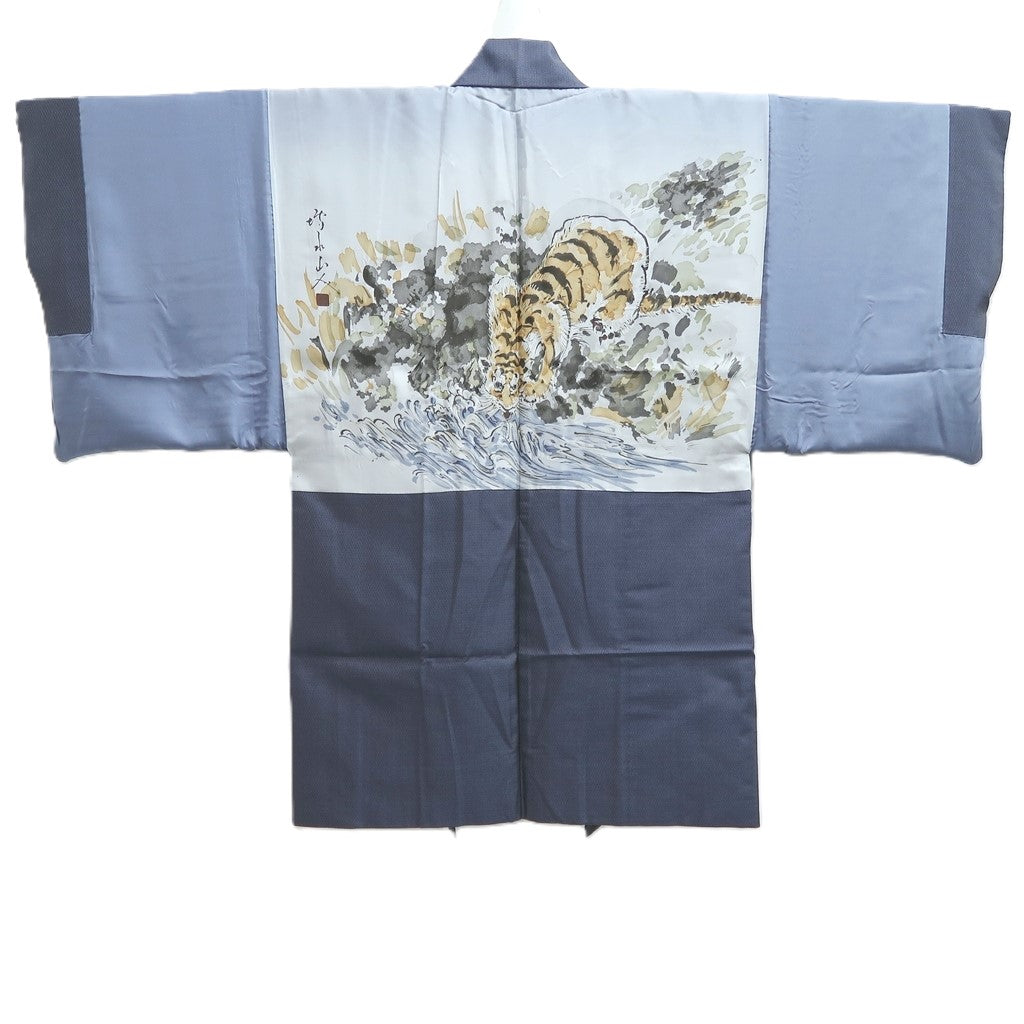 This vintage men's haori boldly showcases striking artwork on its lining, merging traditional craftsmanship with daring artistic expression. Perfect for making a statement in traditional attire, it commands attention with its unique blend of heritage and bold design. When displayed as wall art, it transforms any space into a provocative showcase of culture and creativity.