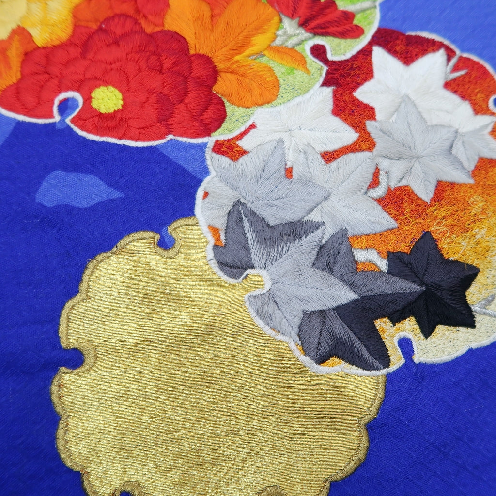 KK1279B5 Silk Kimono Fabric Vintage(1950-1980) Embroidery Matsu Kiku Blue 82.7x11.4in(210x29cm)