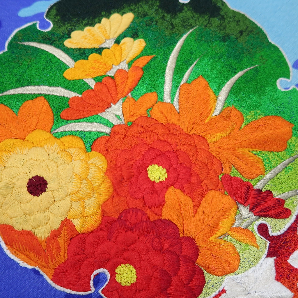 • Load image into Gallery viewer, KK1279B5 Silk Kimono Fabric Vintage(1950-1980) Embroidery Matsu Kiku Blue 82.7x11.4in(210x29cm)