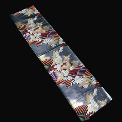 BB10079AF Silk Obi Fabric Heian Princess Crane Birds Silver 50.8x10.6in(129x27cm)