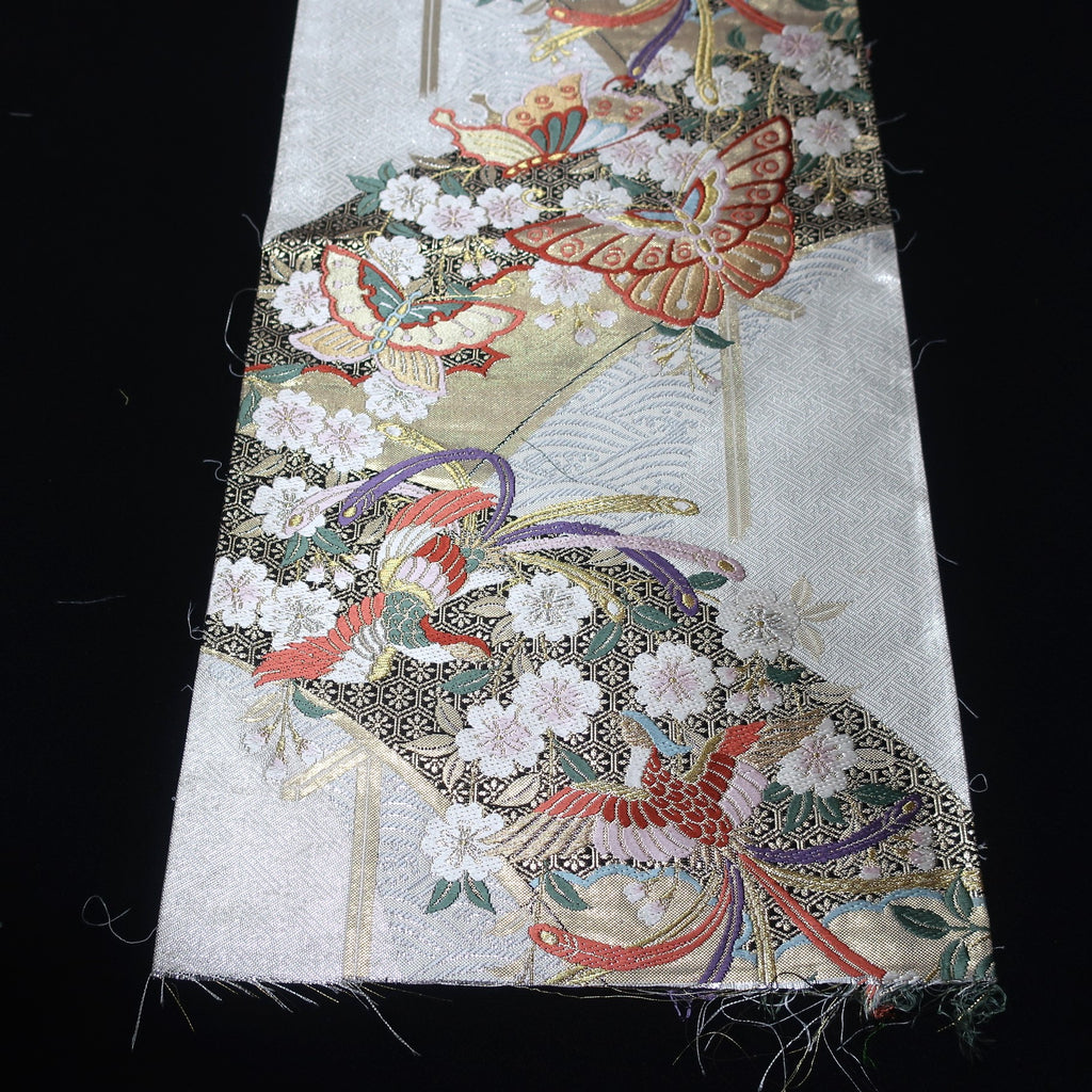 BB10063AE Silk Obi Fabric Butterfly Cherry Blossom White Gold 52.4x11.0in(133x28cm)