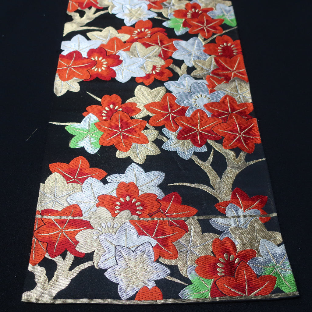 BB10074AF Silk Obi Fabric Maple Leaf Black Red 47.6x10.6in(121x27cm)